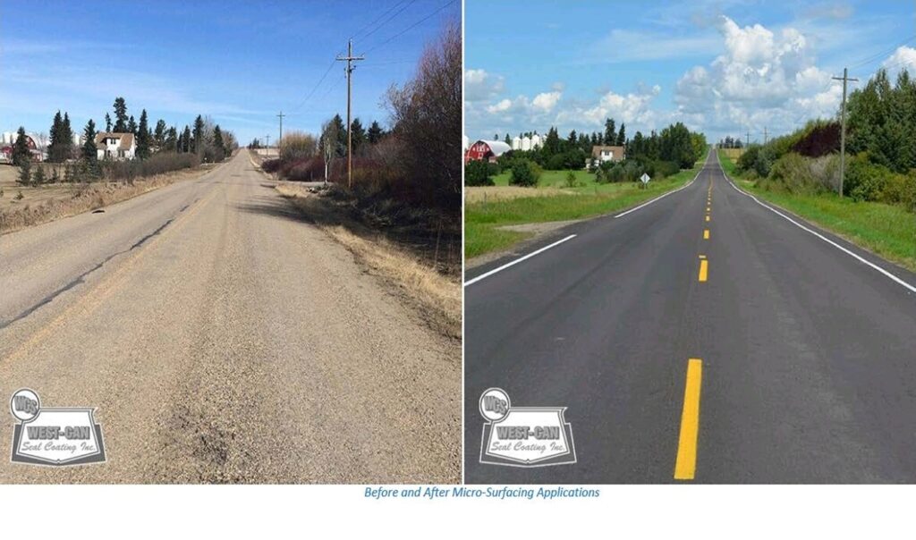 The micro-surfacing process applies a thin asphalt-aggregate mix to the road, with the aim of extending the pavement life by five to eight years.