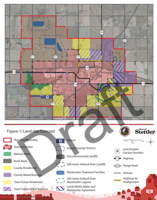 The updated plan notes that development of the Stettler Airport must align with county planning bylaws. The airport is located in the county but is operated by the town.