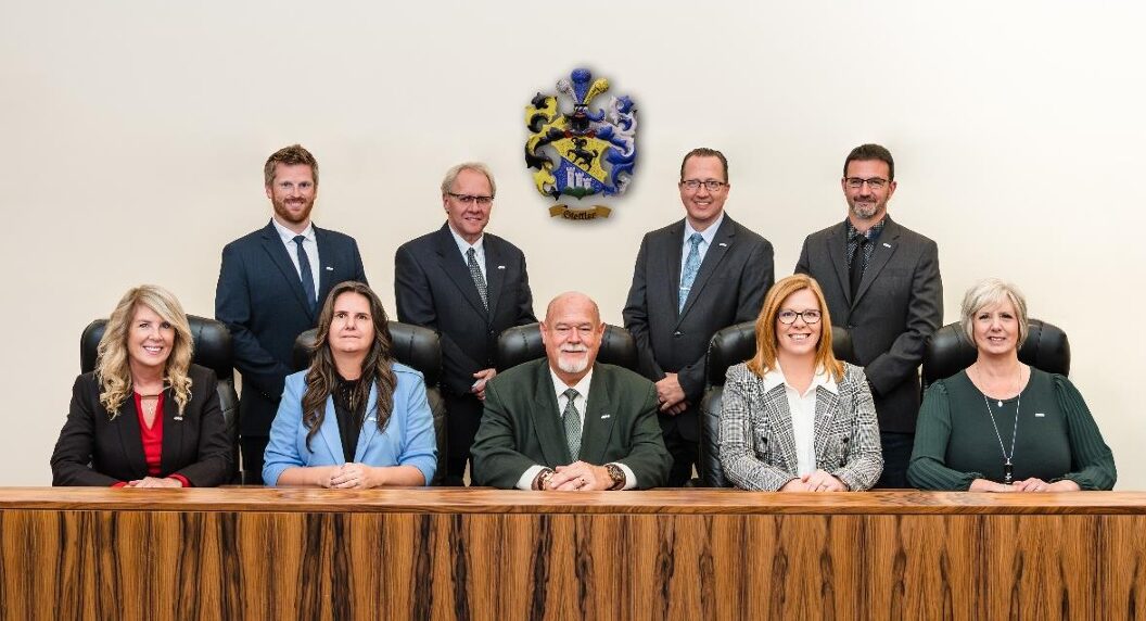 Stettler Town Council 2025-2029 - Back Row - L to R: Coun. Dusty Myshrall, Coun. Scott Pfeiffer, Coun. Wayne Smith, Coun. Kurt Baker, Front Row - L to R: Coun. Sharon Fischer, Assistant CAO Kim Hymers, Mayor Gord Lawlor, CAO Leann Graham, Coun. Cheryl Barros